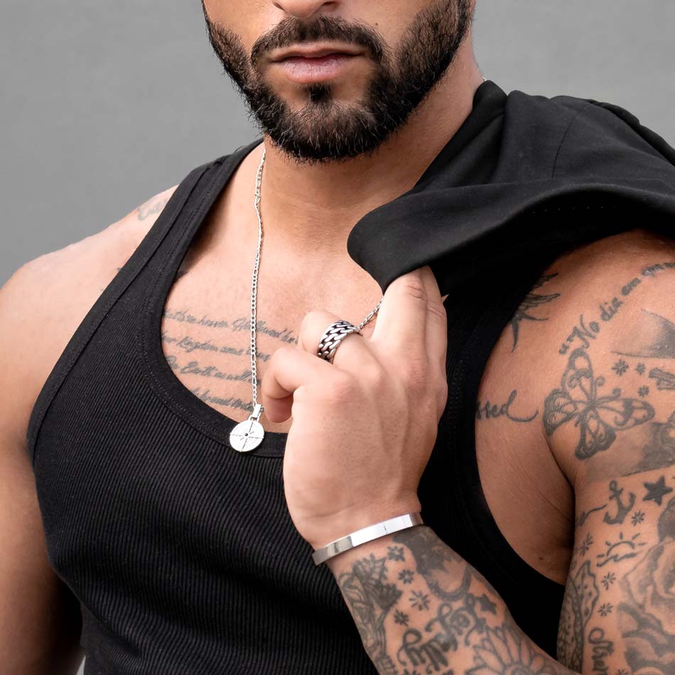 Este anel masculino exibe um design ousado e moderno, com detalhes de corrente entrelaçada em aço inoxidável, conferindo um visual robusto e marcante. O seu acabamento polido realça os detalhes da peça, tornando-a ideal para quem busca um acessório imponente e versátil, capaz de complementar tanto looks casuais quanto mais sofisticados. Uma escolha poderosa para destacar sua personalidade.
