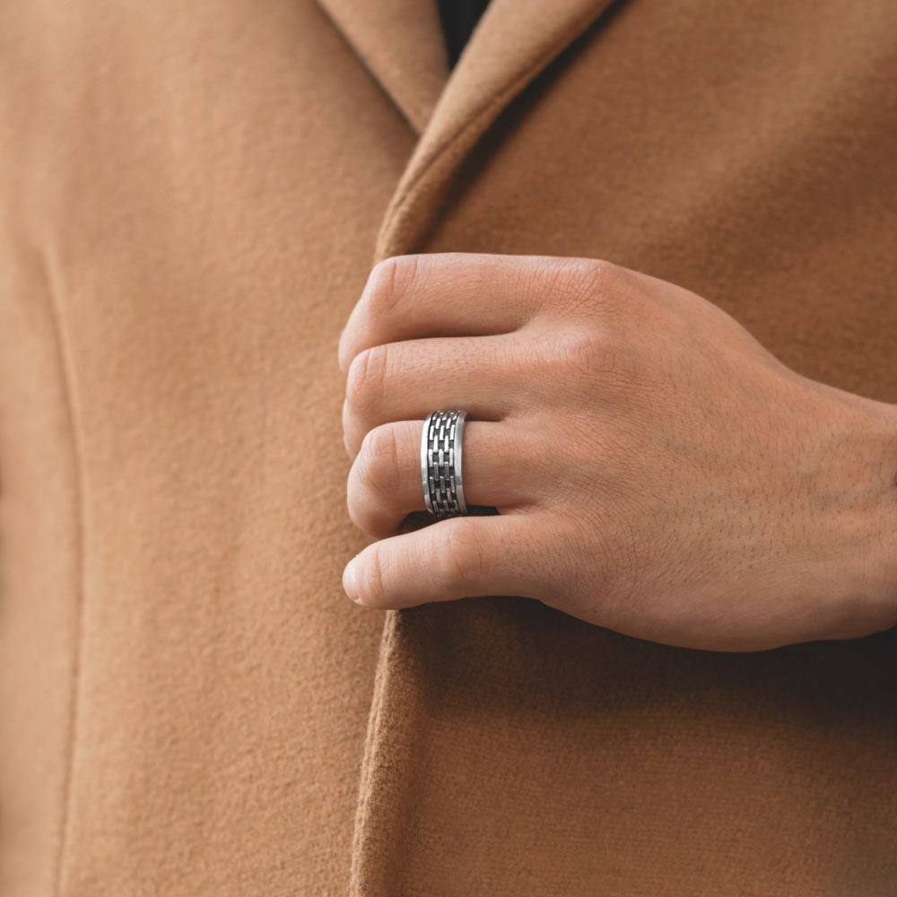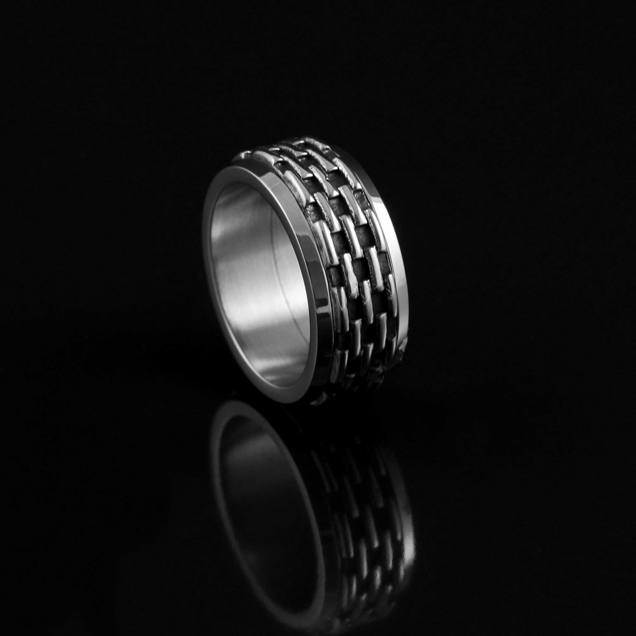 Este anel para homem impressiona com o seu design robusto e textura em padrão entrelaçado, que agrega estilo e personalidade à peça. Com um acabamento polido nas laterais e detalhes texturizados no centro, ele é a escolha ideal para homens que apreciam acessórios de impacto. Além disso, o anel pode ser personalizado com gravações internas, permitindo adicionar nomes, datas ou mensagens únicas, tornando a peça ainda mais especial e significativa.