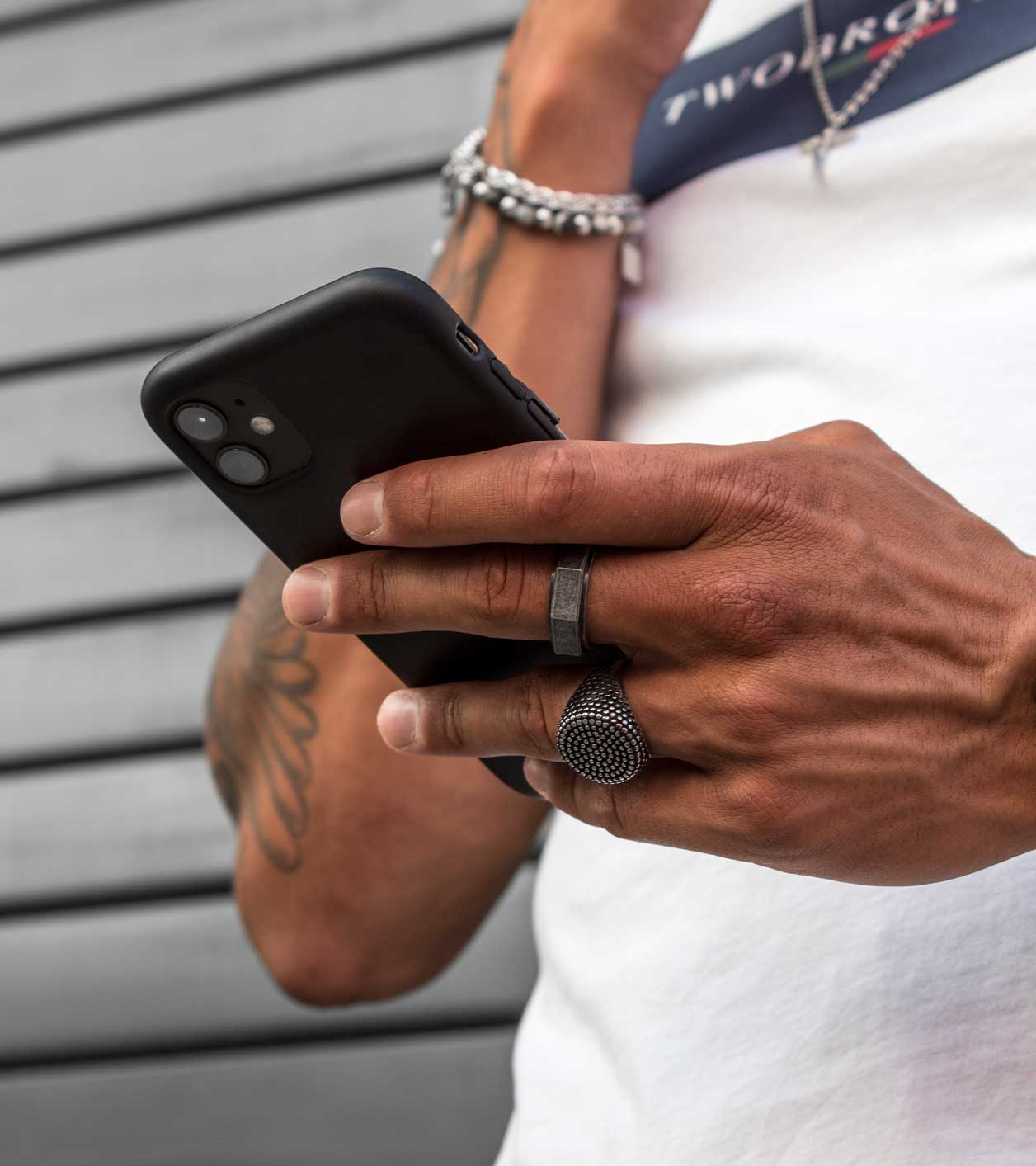 Este anel masculino destaca-se pelo seu design ousado e textura inovadora. A face arredondada e detalhada com um padrão de pontos contrastantes cria um efeito visual marcante, perfeito para homens que procuram um acessório único e cheio de personalidade.