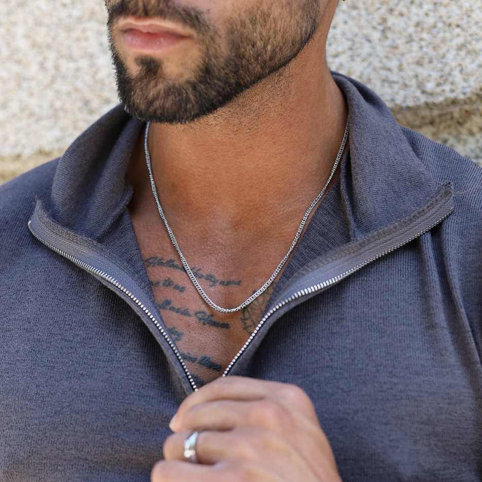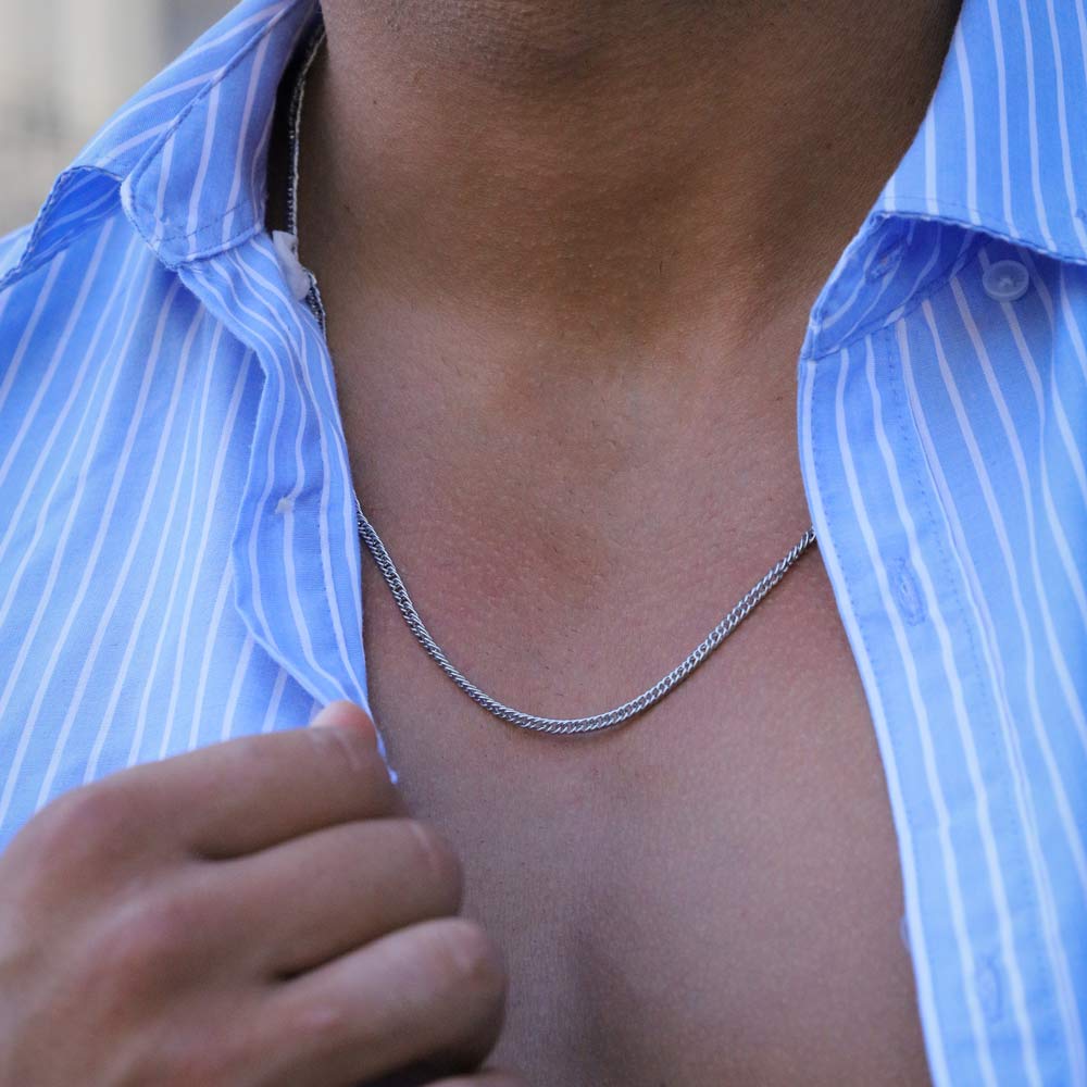 Este colar corrente para homem em aço inoxidável, oferece durabilidade e estilo, destacando-se pela sua resistência e brilho. É um acessório essencial para quem aprecia peças discretas, mas com impacto.