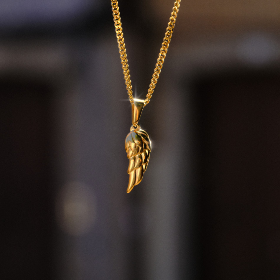 Colar masculino em aço inoxidável com pendente em formato de asa, simbolizando liberdade, proteção e espiritualidade. Fabricado em aço inoxidável, este colar garante durabilidade e resistência ao desgaste, mantendo seu brilho ao longo do tempo. Ideal para uso diário ou ocasiões especiais, é um presente significativo e sofisticado.