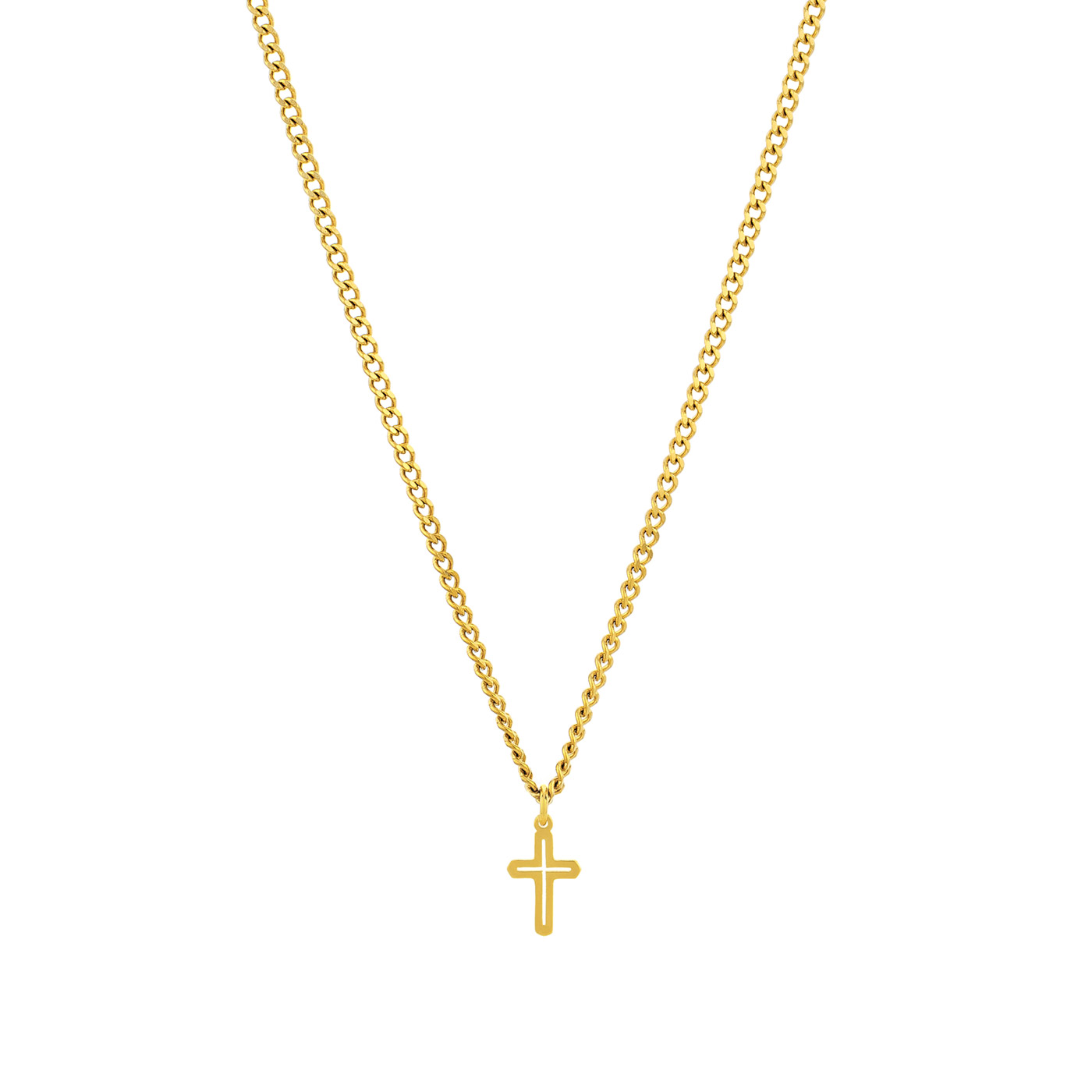 Colar masculino dourado em aço inoxidável com pendente de cruz. Este colar combina elegância e simbolismo, ideal para homens que desejam expressar a sua fé com estilo. Fabricado em aço inoxidável, este colar garante durabilidade e resistência ao desgaste, mantendo seu brilho ao longo do tempo. Ideal para uso diário ou ocasiões especiais, é um presente significativo e sofisticado.