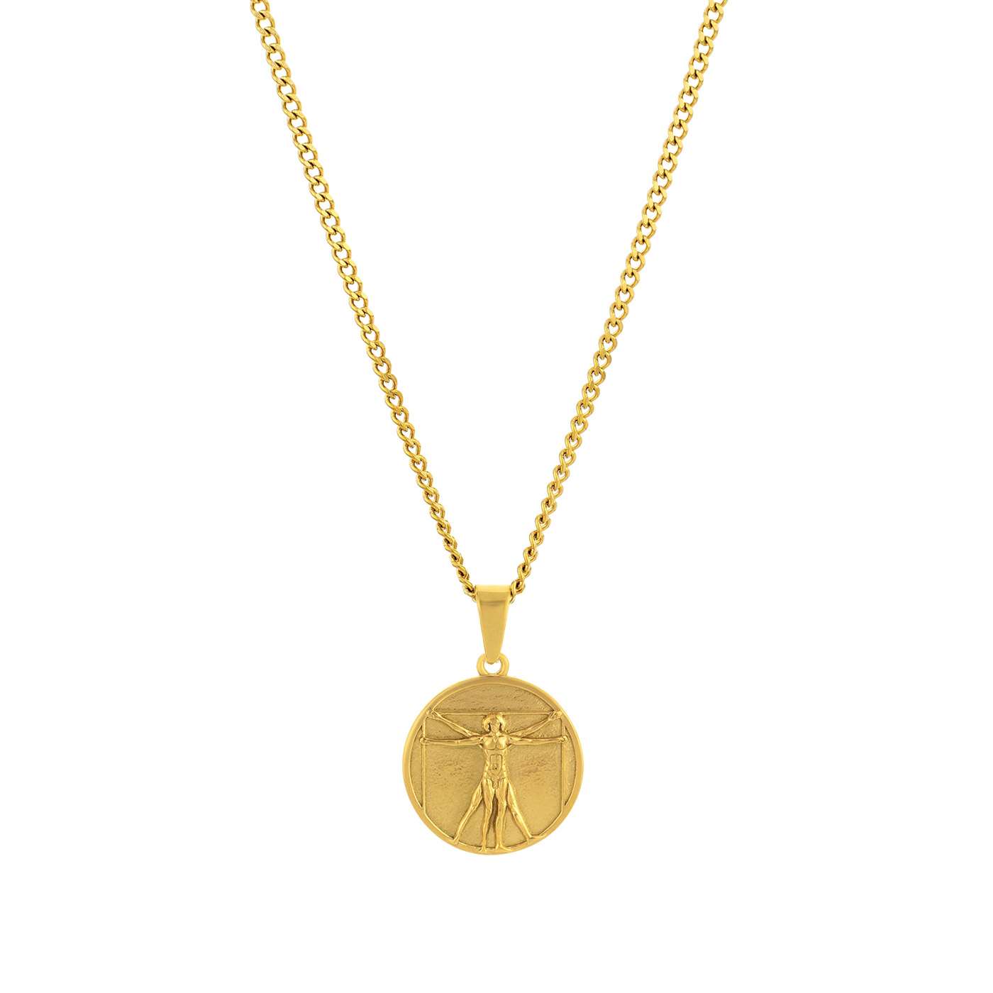 Colar para homem em aço inoxidável dourado com um sofisticado pendente em forma de medalha. O destaque do pendente é o icônico Homem Vitruviano, inspirado na famosa obra de Leonardo da Vinci, simbolizando a harmonia entre arte, ciência e humanidade. Este colar combina um design clássico com um toque de cultura e significado, perfeito para homens que apreciam peças únicas e com história. Ideal para complementar visuais elegantes ou casuais com personalidade e estilo.