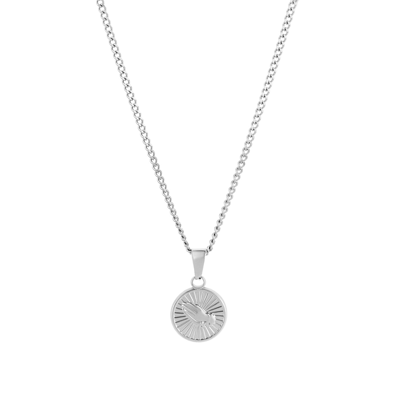 Colar masculino em aço inoxidável prateado com um elegante pendente em formato de medalha. No centro do pendente, um delicado relevo de mãos em oração é destacado por um fundo texturizado que simboliza fé e espiritualidade. Este acessório combina significado e estilo, sendo perfeito para complementar qualquer visual com um toque de sofisticação e conexão pessoal. Uma peça ideal para homens que valorizam símbolos de crença e proteção.