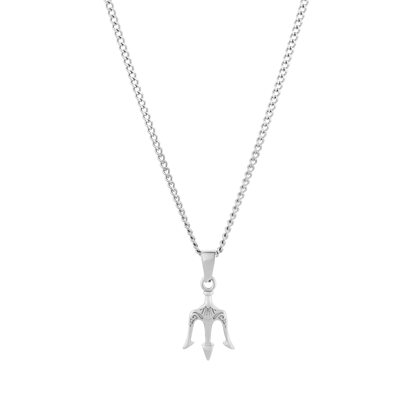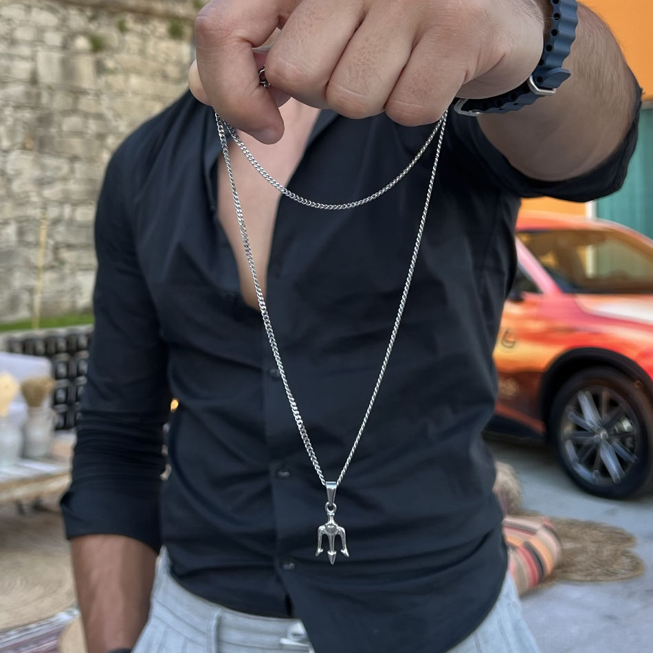 Colar para homem prateado em aço inoxidável prateado e um imponente pendente no formato do Tridente de Poseidon, símbolo de poder e força ligado à mitologia grega. O pendente apresenta um design detalhado, que evoca o domínio dos mares e a energia do deus Poseidon. Ideal para homens que procuram um acessório elegante, com personalidade e significado. Este colar combina estilo contemporâneo com resistência, sendo perfeito para uso diário ou como destaque em ocasiões especiais.