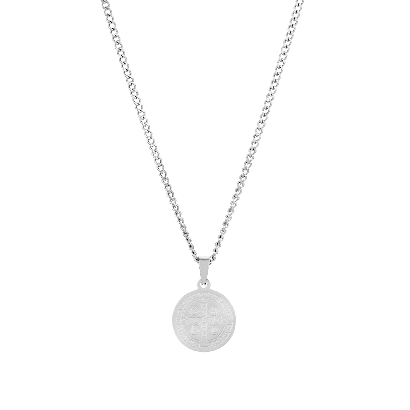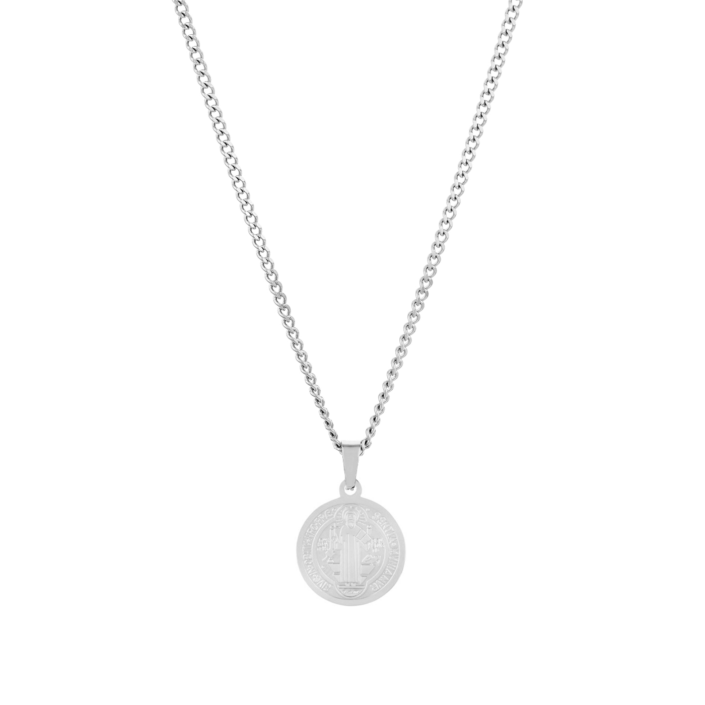 Colar masculino em aço inoxidável prateado com um pendente em formato de medalha detalhadamente trabalhado. A medalha exibe um design clássico e atemporal, ideal para homens que apreciam acessórios com significado e elegância. Este colar combina versatilidade com um toque de sofisticação, perfeito para compor looks casuais ou formais, trazendo personalidade e estilo ao visual.