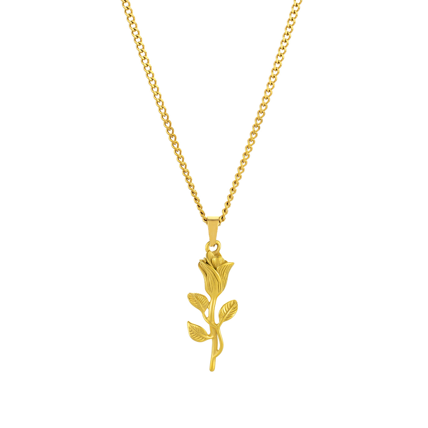 Colar para homem em aço inoxidável dourado com um pendente em formato de rosa, representando elegância e significado. Este design combina robustez e sofisticação, criando uma peça única que destaca o estilo e a personalidade de quem a usa. Perfeito para complementar tanto visuais casuais quanto mais formais.
