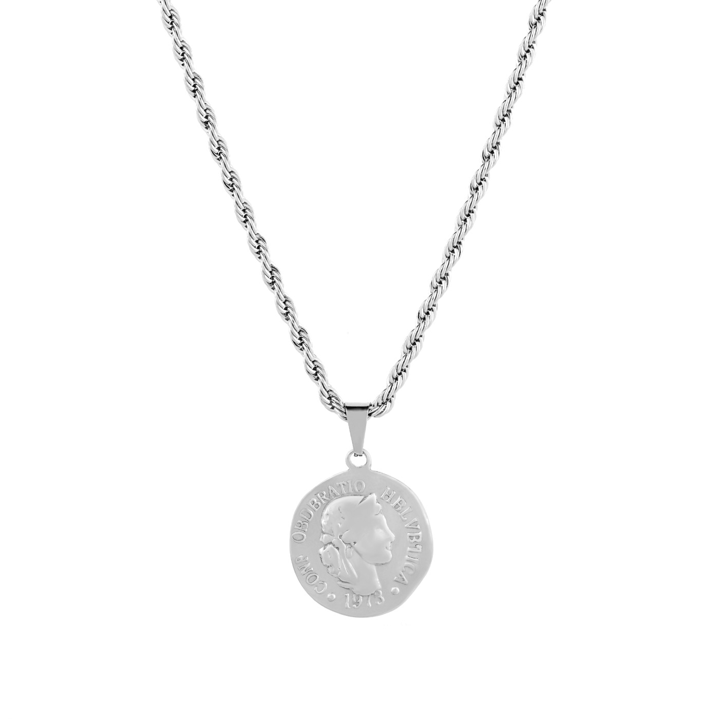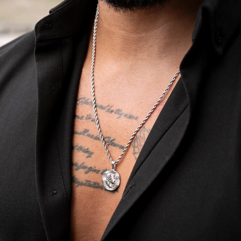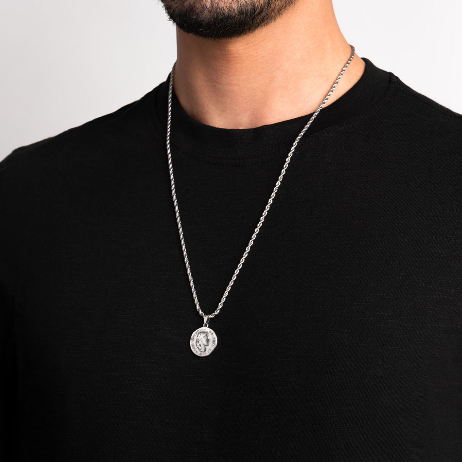 Colar masculino com corrente em aço inoxidável prateado, acompanhado de um pendente em forma de medalha detalhadamente gravada. Este acessório sofisticado e atemporal traz um design clássico e minimalista, ideal para complementar diferentes estilos com um toque de elegância. Perfeito para uso diário ou como presente especial, é uma peça versátil que combina simbolismo e modernidade.