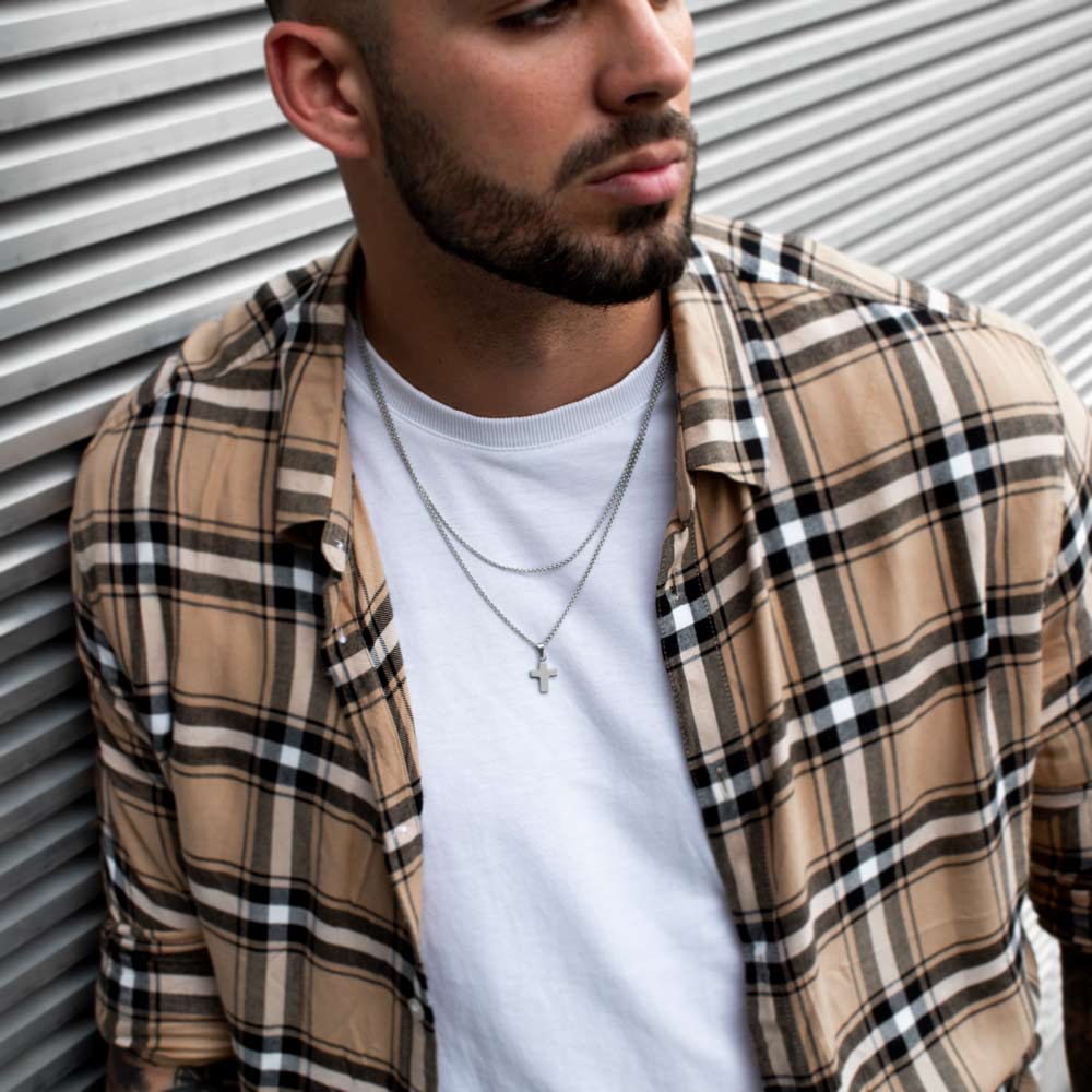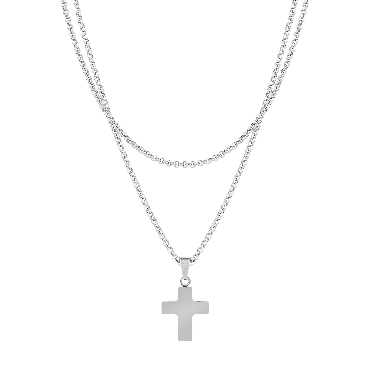 Este conjunto de colares é composto por dois colares de diferentes comprimentos. O destaque neste conjunto é o pendente em formato de cruz, que adiciona um toque simbólico e atemporal ao acessório