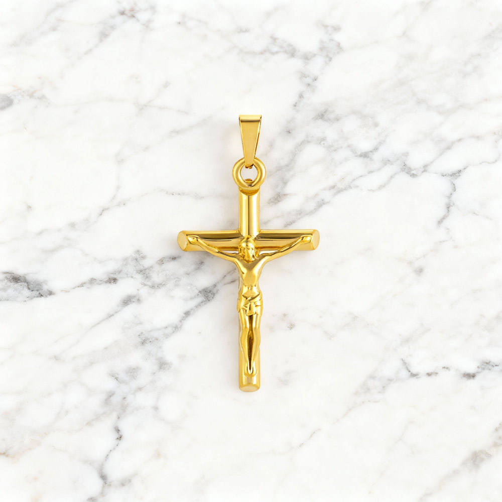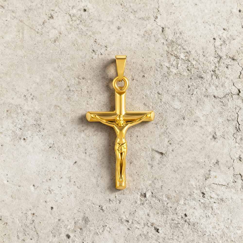 O pendente Cruz Jesus Cristo Gold é produzido em aço inoxidável antialérgico dourado, ideal para adicionar a um colar da Twobrothers com uma largura máxima de 0,35 cm.