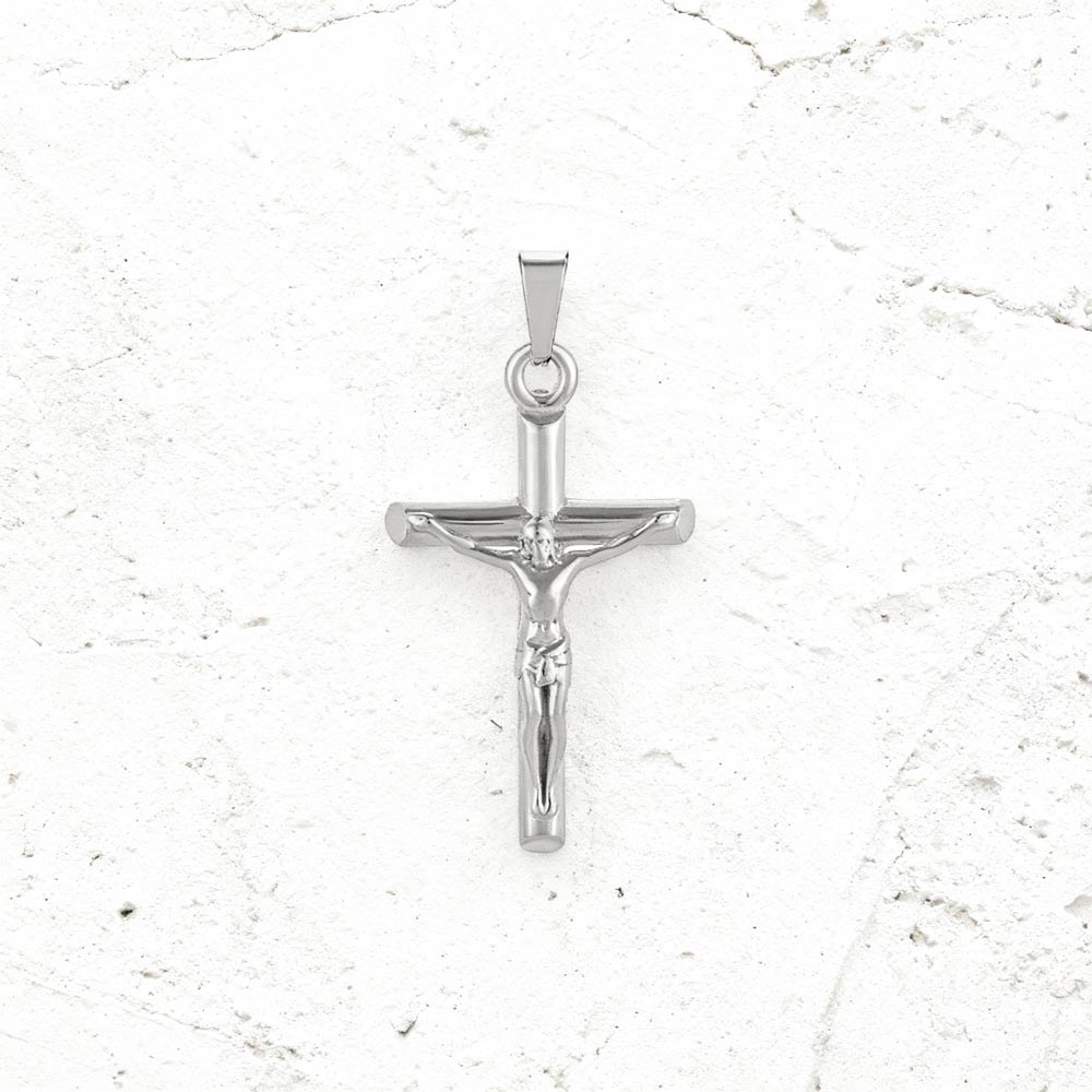 O pendente Cruz Jesus Cristo é produzido em aço inoxidável antialérgico, ideal para adicionar a um colar da Twobrothers com uma largura máxima de 0,35 cm.