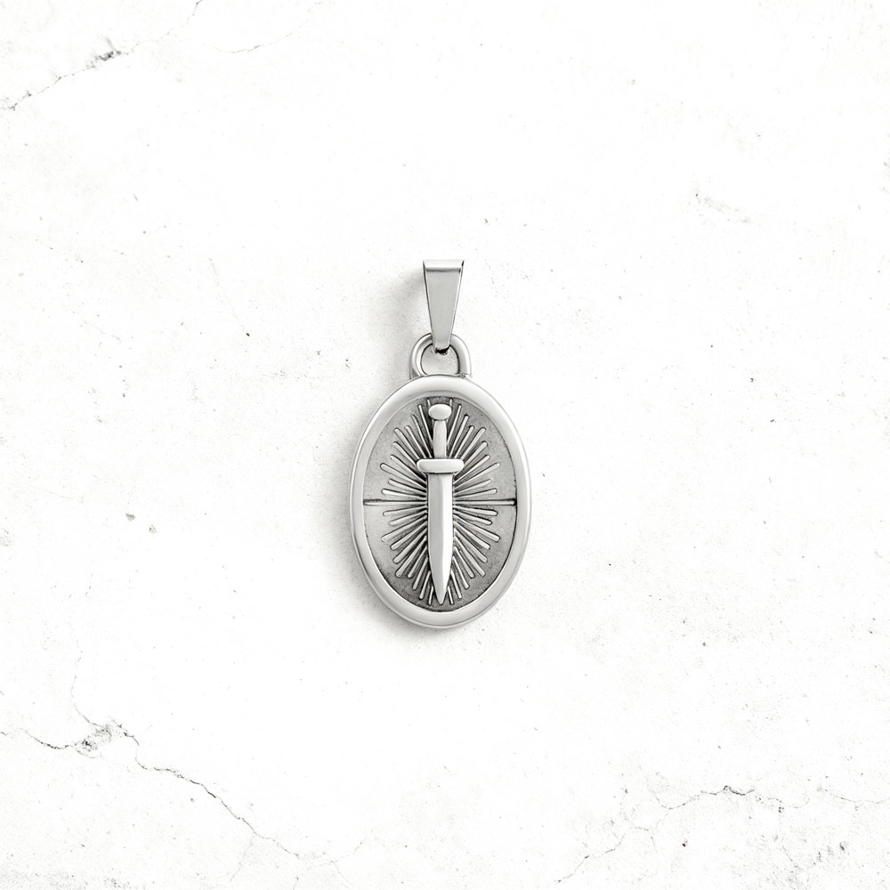 O pendente Medalha Cowpens, com uma espada, é produzido em aço inoxidável antialérgico, ideal para adicionar a um colar da Twobrothers com uma largura máxima de 0,35 cm.