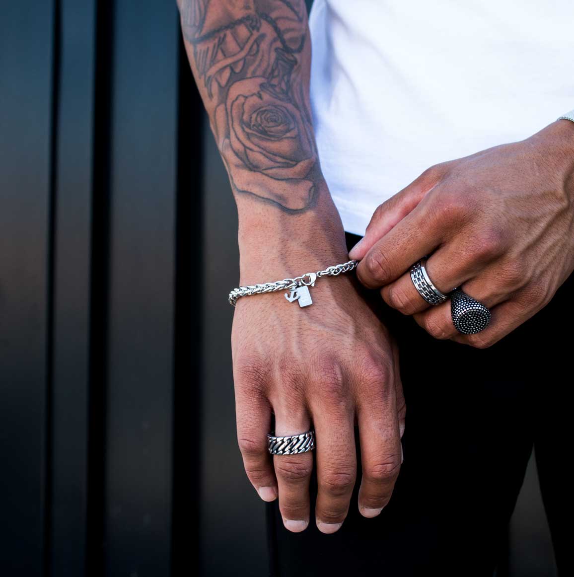 Esta pulseira para homem prateada e com um pendente em forma de âncora, representando força e estabilidade, é o acessório ideal para quem procura um toque de estilo náutico e moderno.