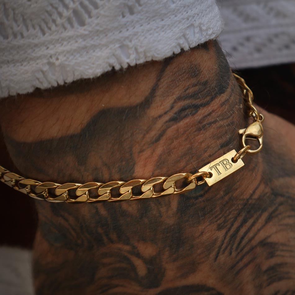 Pulseira masculina dourada com um design moderno de elos robustos, esta peça apresenta um acabamento polido que realça o seu brilho intenso, proporcionando um visual impecável e refinado.