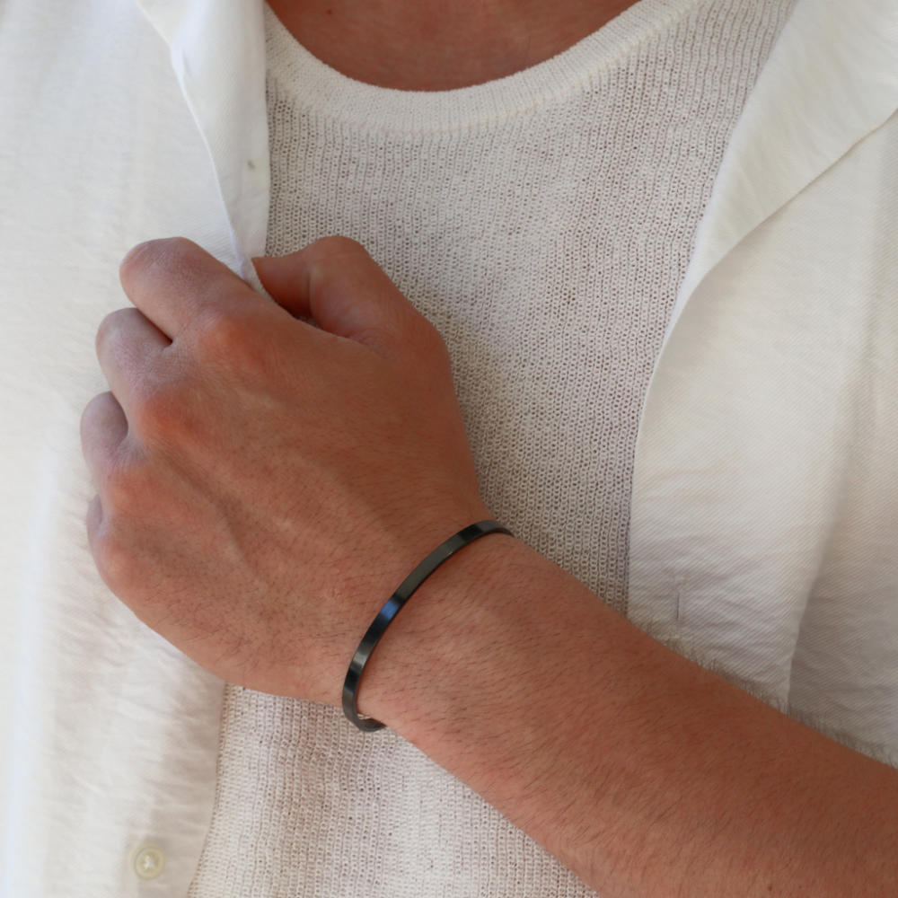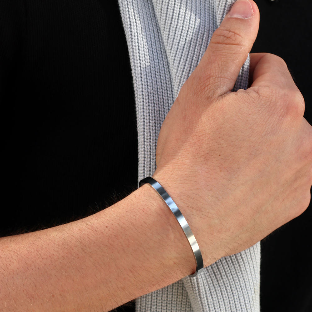 O design aberto facilita o ajuste ao pulso, proporcionando conforto e praticidade. Ideal para complementar tanto looks casuais quanto formais, esta pulseira traz um toque de sofisticação minimalista, perfeita para homens que buscam um acessório durável e de bom gosto.