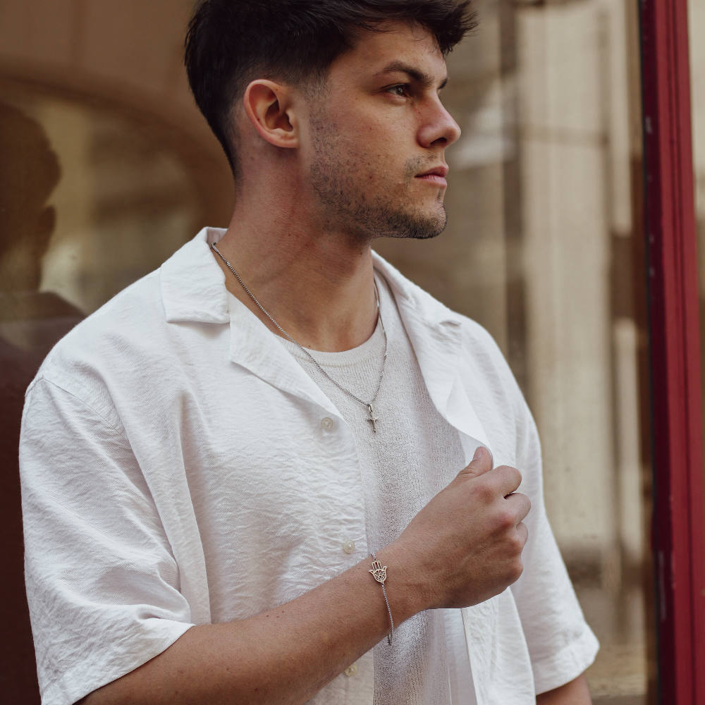 O motivo pelo qual a Pulseira Prateada Mão de Fátima é a escolha certa? Esta pulseira para homem, fina, prateada e com um pendente em forma de Mão de Fátima — símbolo de proteção, sorte e força espiritual — é o acessório ideal para quem procura aliar estilo, qualidade e um toque místico que transmite segurança e boas energias.
