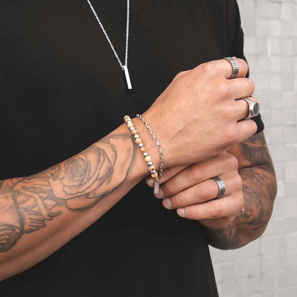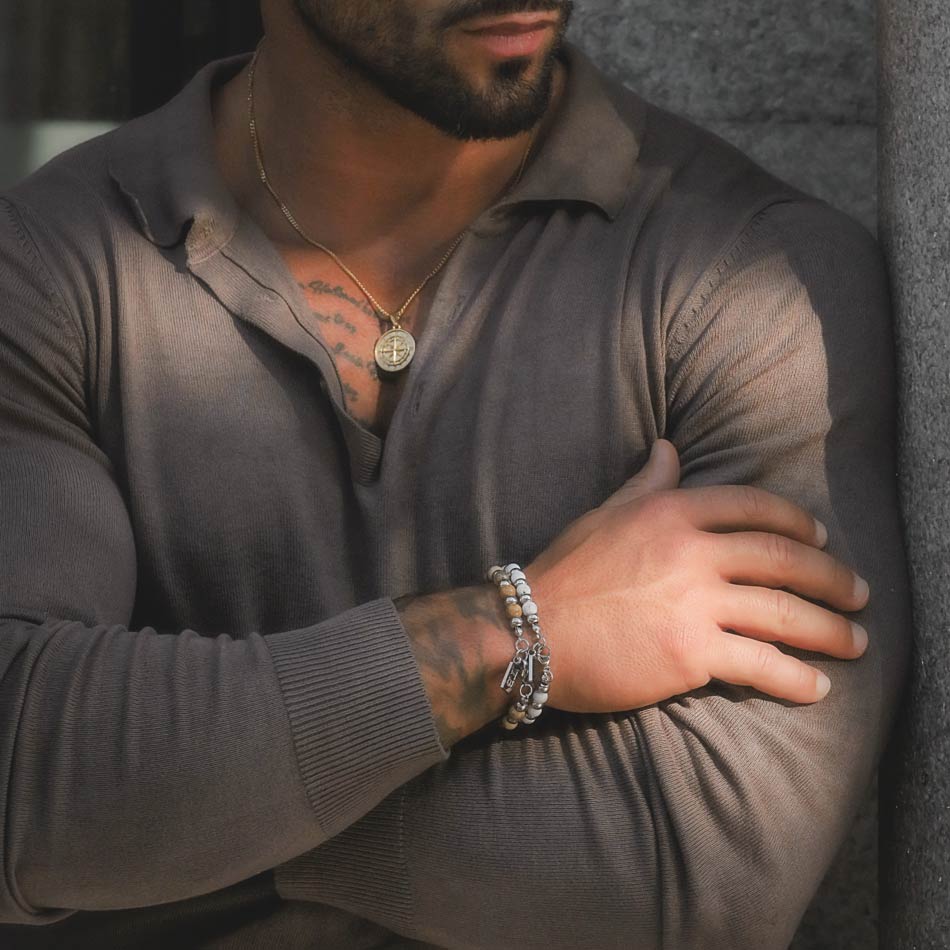 Esta pulseira destaca o contraste elegante entre as poderosas pedras de jasper e o brilho sofisticado das esferas de aço inoxidável. Cada conta revela variações de tons acastanhados e beges, criando uma pulseira versátil que traz um toque de natureza e sofisticação para qualquer look.