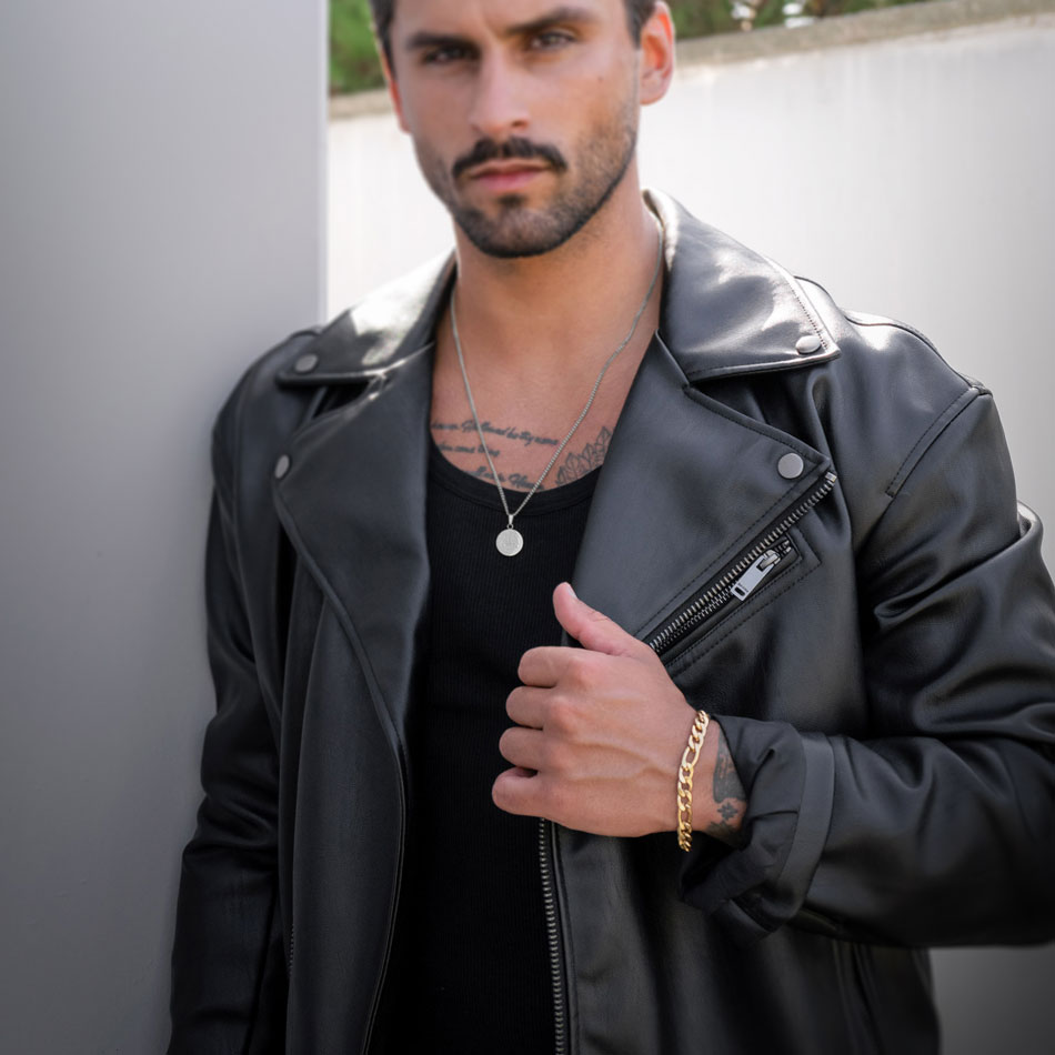 Pulseira masculina dourada com um design moderno de elos robustos, esta peça apresenta um acabamento polido que realça o seu brilho intenso, proporcionando um visual impecável e refinado.