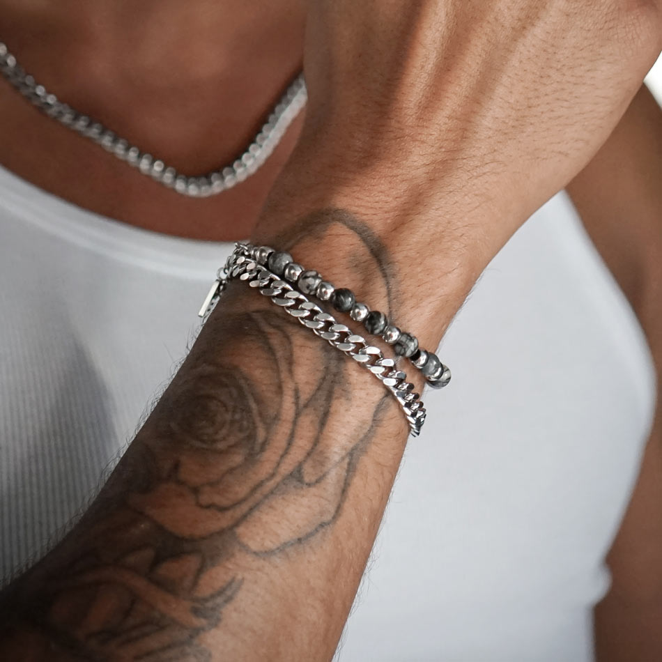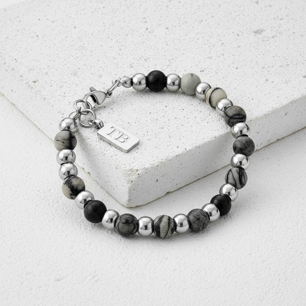 Sofisticada e moderna, esta pulseira combina pedras naturais de jasper cinza com esferas polidas de aço inoxidável, criando um contraste subtil e elegante. O jasper cinza, com suas variações únicas de tons e padrões, evoca uma sensação de equilíbrio e força.