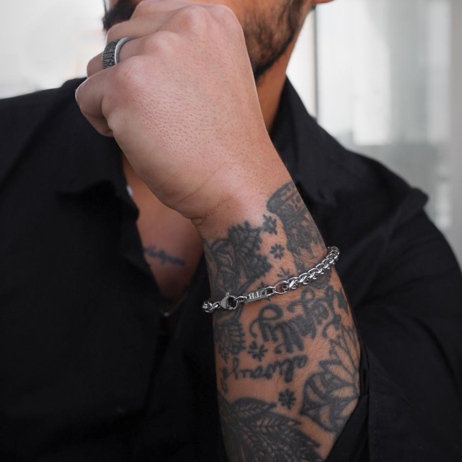 Esta pulseira para homem prateada não é apenas um acessório; é uma afirmação de estilo. Combinando resistência e robustez, ela é a escolha perfeita para quem valoriza um apontamento elegante e discreto.