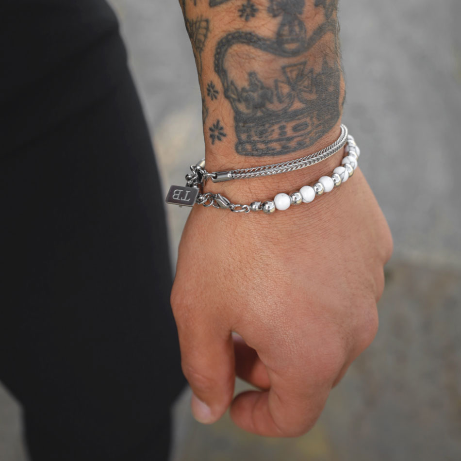 Esta elegante pulseira apresenta pedras de jasper branco alternadas com esferas de aço inoxidável polido. O jasper branco, com suas subtis veias cinzentas, simboliza paz e tranquilidade, enquanto as esferas de aço trazem um contraste brilhante e durável, que confere um toque contemporâneo à pulseira.
