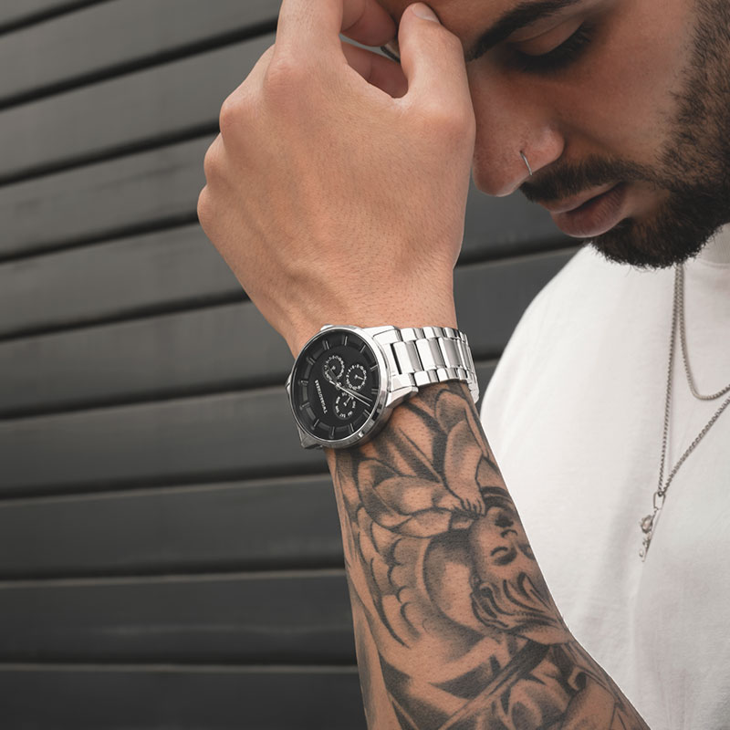 Elegância e resistência estão presentes neste relógio masculino em aço inoxidável. O seu design robusto e sofisticado é complementado pelo mostrador preto de alto contraste, protegido por um vidro de safira, extremamente resistente a riscos. A bracelete em aço inoxidável com elos proporciona um ajuste confortável e seguro, garantindo durabilidade e um visual clássico.