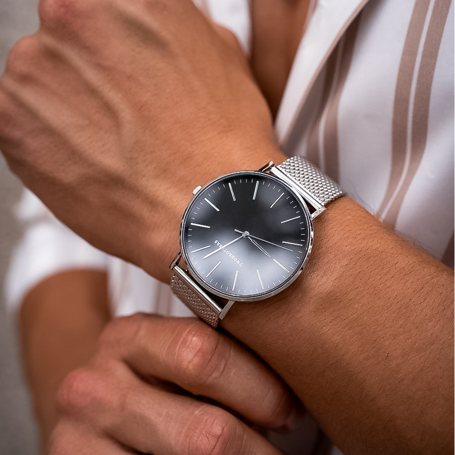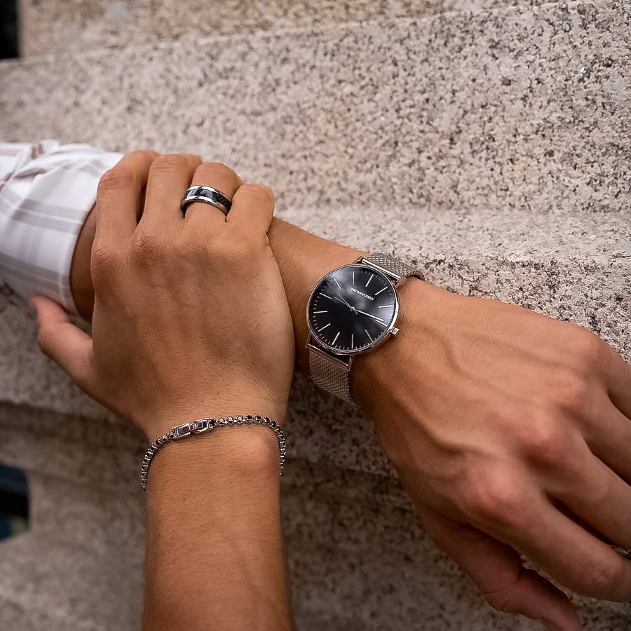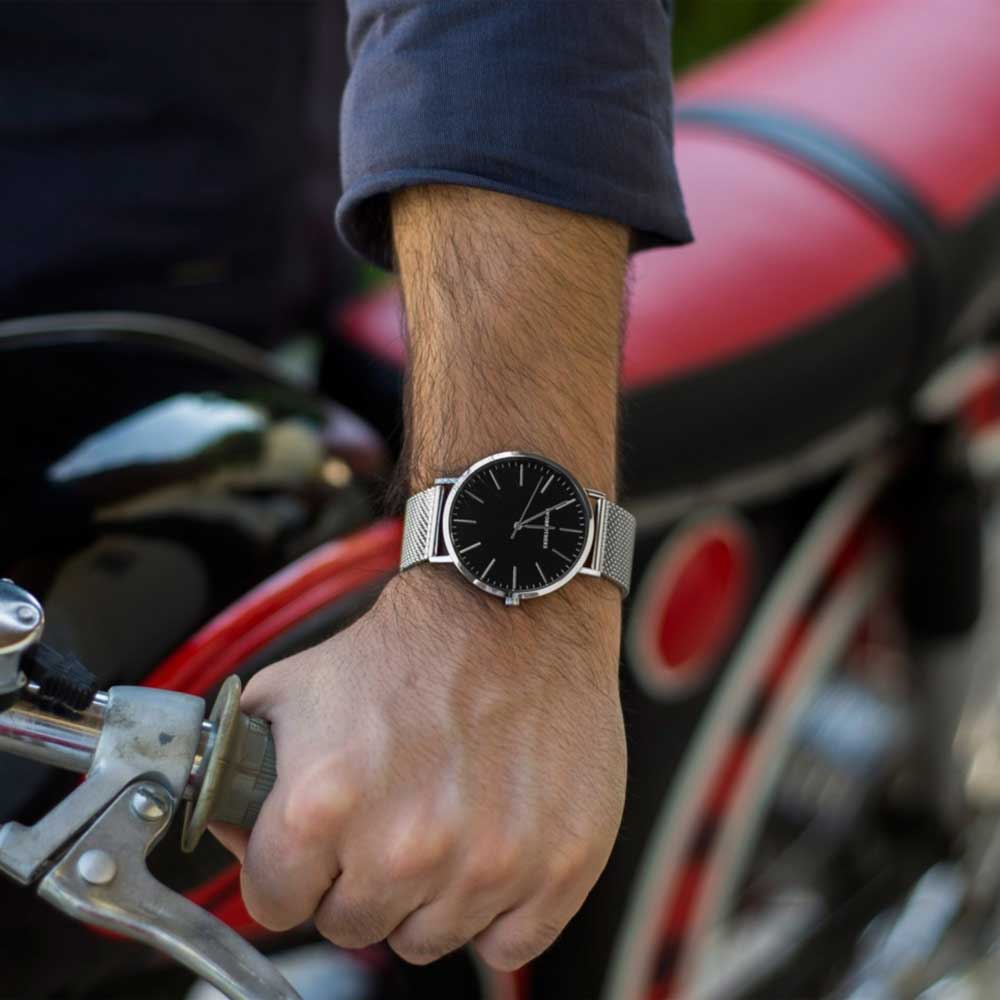 Sofisticado e moderno, este relógio masculino em aço inoxidável combina um design minimalista com materiais premium. O mostrador preto elegante é protegido por vidro de safira, altamente resistente a riscos, garantindo longevidade e clareza. A bracelete em malha mesh de aço inoxidável confere conforto, leveza e um toque contemporâneo ao visual, proporcionando um ajuste perfeito ao pulso.