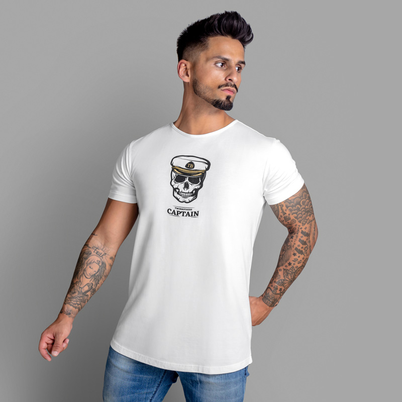 Para a produção desta T-shirt para homem na cor branca, com uma caveira estampada a preto com elementos dourados, foi selecionado o melhor Algodão, e aplicado o acabamento Anti-Pilling, garantindo assim que a t-shirt é de qualidade e conforto Premium.