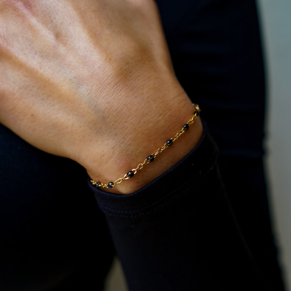 Minimalista e sofisticada, esta pulseira dourada é um acessório delicado e versátil para qualquer ocasião. Fabricada em aço inoxidável de alta qualidade com acabamento dourado resistente, apresenta um design fino e elegante. Pequenas pedras enamel em tom escuro estão intercaladas ao longo da corrente, proporcionando um toque de cor sutil e refinado.